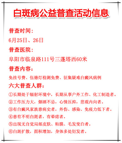 6.25世界白癜风日,让我们为爱而行!为提高广大百姓对白癜风疾病的防治意识,由阜阳皮肤病医院举办的“白斑病免费大普查公益活动”将于6月25日全面启动,活动将持续2天,通过免费白斑普查等形式,为广大百姓提供专业的检查。
